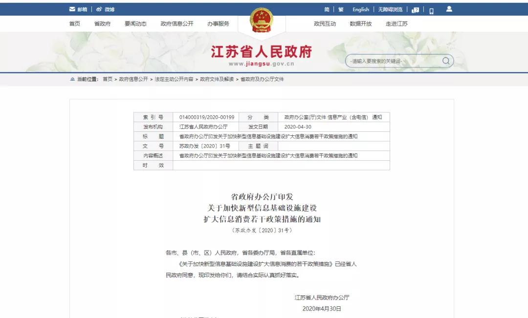 江蘇省《關(guān)于加快新型信息基礎(chǔ)設(shè)施建設(shè)擴(kuò)大信息消費(fèi)的若干政策措施》正式公開(kāi)發(fā)布,2020年計(jì)劃投資120億元,新建5G基站5.2萬(wàn)個(gè)。