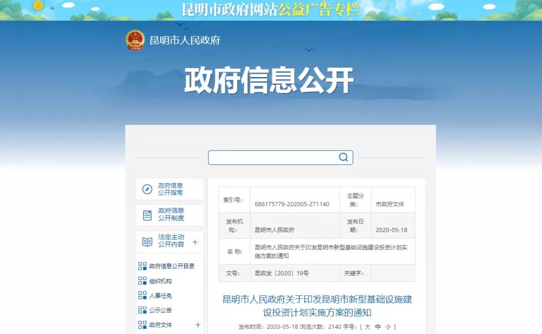 面向“十四五”,云南省將緊密結(jié)合實(shí)際統(tǒng)籌規(guī)劃新基建,今年云南省昆明市擬投資589億元建設(shè)“新基建”,此前出爐的《昆明市新型基礎(chǔ)設(shè)施建設(shè)投資計(jì)劃實(shí)施方案》提出新基建五大領(lǐng)域,重點(diǎn)項(xiàng)目394個(gè),總投資10011.8億元。