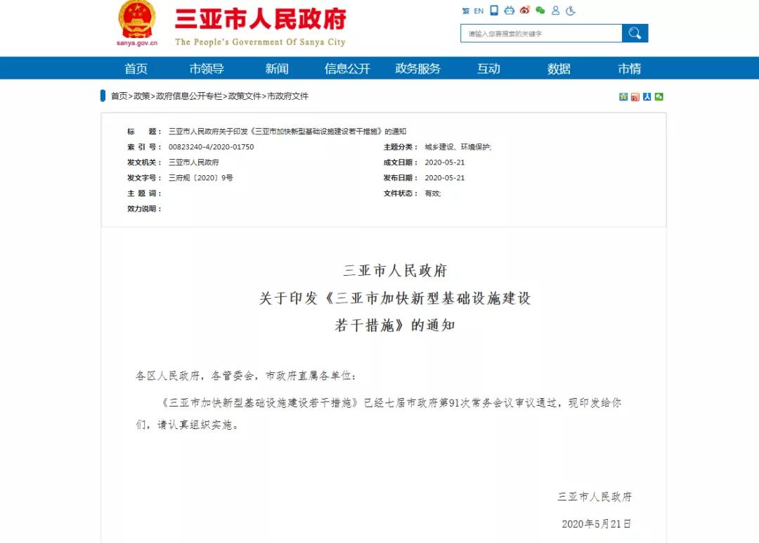 海南省三亞市人民政府印發(fā)《三亞市加快新型基礎(chǔ)設(shè)施建設(shè)若干措施》其中包括5G基站、智慧城市、深海科技、遙感信息產(chǎn)業(yè)園重點(diǎn)產(chǎn)業(yè)園區(qū)等基礎(chǔ)設(shè)施建設(shè)。