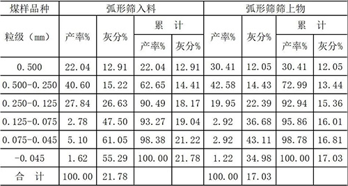 表1是技改前使用弧形篩對(duì)TBS精礦溢流進(jìn)行截粗分級(jí)時(shí),弧形篩的入料和篩上物的篩分試驗(yàn)資料。從篩分試驗(yàn)資料對(duì)比可以看出入料和篩上物的灰分相差不到5%,說(shuō)明弧形篩篩分效率低,降灰效果極差。