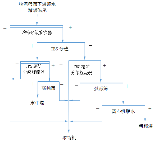 龍泉選煤廠技改前粗煤泥分選回收工藝為:旋流器濃縮+TBS分選+旋流器濃縮+弧形篩脫泥脫水+離心機(jī)脫水。具體工藝見圖1。