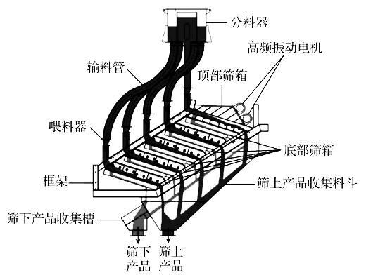 方園FY-HVS-1500型高頻疊篩是一種借助于篩面高頻振動(dòng)力和物料重力實(shí)現(xiàn)按物料粒度分級(jí)的機(jī)械設(shè)備,其結(jié)構(gòu)主要由分料器、喂料器、上下篩框、高頻振動(dòng)電機(jī)、篩上產(chǎn)品收集料斗、篩下產(chǎn)品收集槽、框架及支撐平臺(tái)等部分組成。篩機(jī)的工作原理見圖2。其主要特征及優(yōu)勢(shì)有以下幾點(diǎn)。