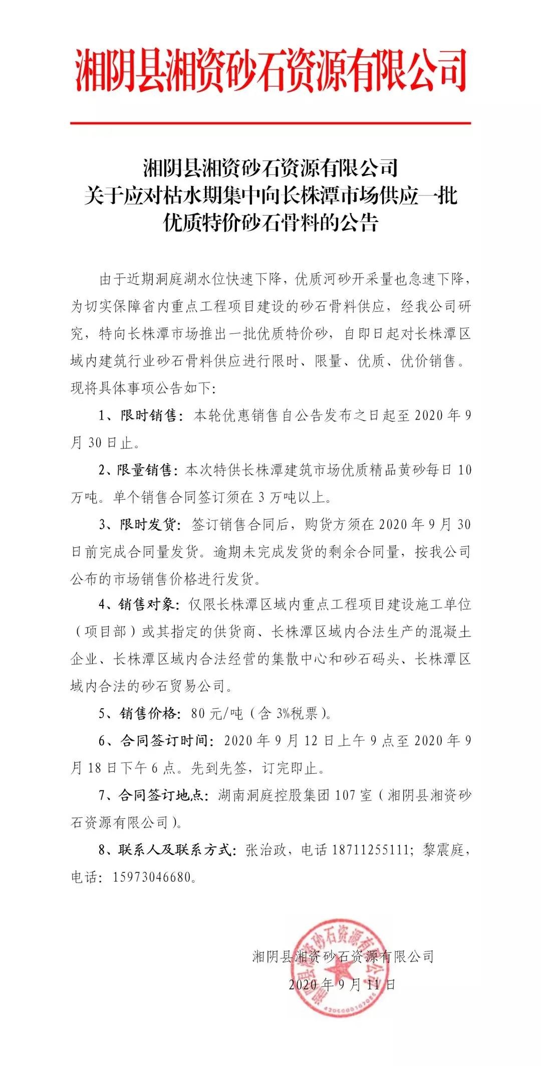 9月11日至9月30日,湘陰縣湘資砂石資源有限公司將面向長株潭市場推出一批優(yōu)質(zhì)特價砂,進行限時、限量、優(yōu)質(zhì)、優(yōu)價供應(yīng)。