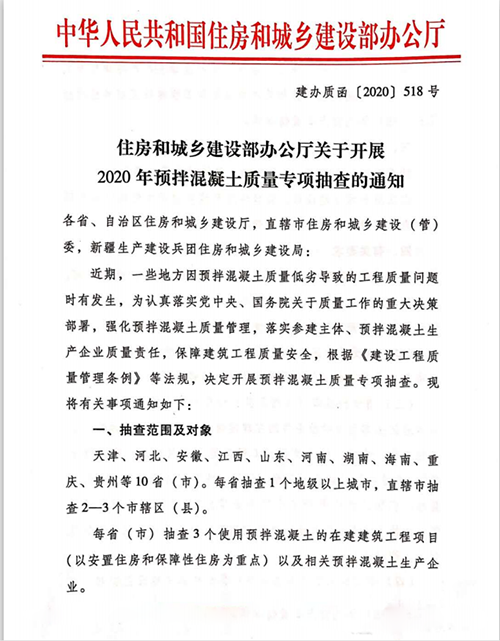 通知稱,近期,一些地方因預(yù)拌混凝土質(zhì)量低劣導(dǎo)致的工程質(zhì)量問題時有發(fā)生,為認真落實黨中央、國務(wù)院關(guān)于質(zhì)量工作的重大決策部署,強化預(yù)拌混凝土質(zhì)量管理,落實參建主體、預(yù)拌混凝土生產(chǎn)企業(yè)質(zhì)量責(zé)任,保障建筑工程質(zhì)量安全,根據(jù)《建設(shè)工程質(zhì)量管理條例》等法規(guī),決定開展預(yù)拌混凝土質(zhì)量專項抽查。