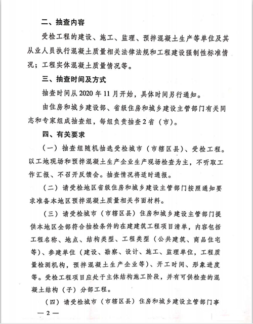 (一)抽查組隨機抽選受檢城市(市轄區(qū)縣)、受檢工程。以工地現(xiàn)場和預(yù)拌混凝土生產(chǎn)企業(yè)生產(chǎn)現(xiàn)場檢查為主,不聽取工作匯報、不召開反饋會。抽查情況將適時通報。
