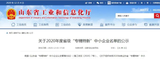 12月3日,山東省工業和信息化廳對2020年度山東省“專精特新”企業評選入圍企業進行公示,濰坊天潔環??萍加邢薰境晒θ雵?。