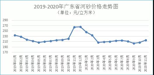 據(jù)監(jiān)測(cè),11月份廣東省河砂購(gòu)進(jìn)價(jià)為每立方米215元,環(huán)比(與2020年10月比,下同)上升3.85%,同比(與2019年11月比,下同)下降18.44%。其中,珠三角、粵北、粵西和粵東地區(qū)河砂購(gòu)進(jìn)價(jià)分別為每立方米229元、201元、205元和234元,環(huán)比分別上升8.11%、2.73%、0.82%和0.27%。