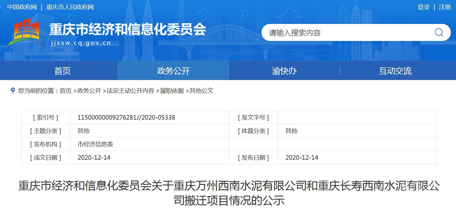 按照《國務院關于化解產能嚴重過剩矛盾的指導意見》(國發〔2013〕41號)、《國務院辦公廳關于促進建材工業穩增長調結構增效益的指導意見》(國辦發〔2016〕34號)和《工業和信息化部關于印發鋼鐵水泥玻璃行業產能置換實施辦法的通知》(工信部原〔2017〕337號)要求,現將重慶萬州西南水泥有限公司和重慶長壽西南水泥有限公司水泥熟料生產線搬遷項目情況予以公示,公示期2020年12月14日-2020年12月18日(5個工作日)。 聯系電話:023-63899843 傳真:023-63899842 通訊地址:重慶市渝北區云杉南路12號。