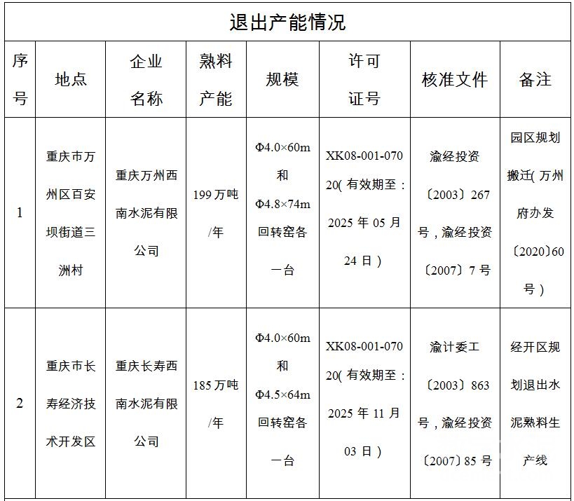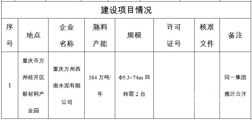 重慶市經濟和信息化委員會關于重慶萬州西南水泥有限公司和重慶長壽西南水泥有限公司搬遷項目情況的公示顯示,重慶萬州西南水泥有限公司兩臺回轉窯(共計199萬噸熟料產能)、重慶長壽西南水泥有限公司兩臺回轉窯(共計185萬噸熟料產能)將合并搬遷至萬州經開區,建設兩臺回轉窯,產能為384萬噸。