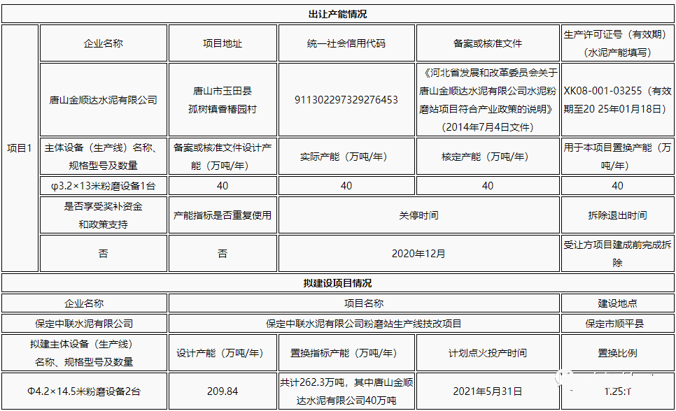 唐山金順達(dá)水泥有限公司年產(chǎn)水泥粉磨生產(chǎn)線產(chǎn)能出讓方案