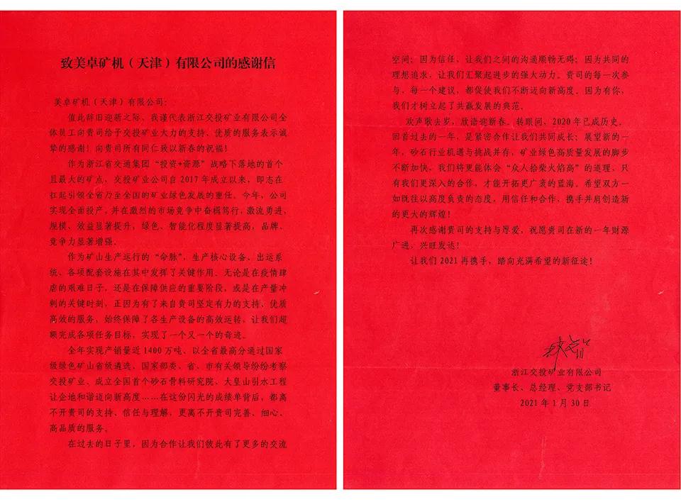 “全年實現產銷量近1400萬噸、以全省最高分通過國家級綠色礦山省級遴選、國家部委、省、市有關領導紛紛考察交投礦業、成立全國首個砂石骨料研究院、大皇山引水工程讓企地和諧邁向新高度……”在浙江交投礦業公司致供應商的一封信中這樣寫道。對此,美卓奧圖泰大中華區骨料業務銷售總經理李子強先生表示:“我為我們的客戶從行業中脫穎而出取得這樣的成績感到驕傲,也由衷為我們的團隊為此做出的貢獻感到自豪。讓骨料行業更高效、更綠色、更智能是我們的使命,希望我們能夠有機會繼續助力交通資源公司打造更多的綠色智能礦山。”