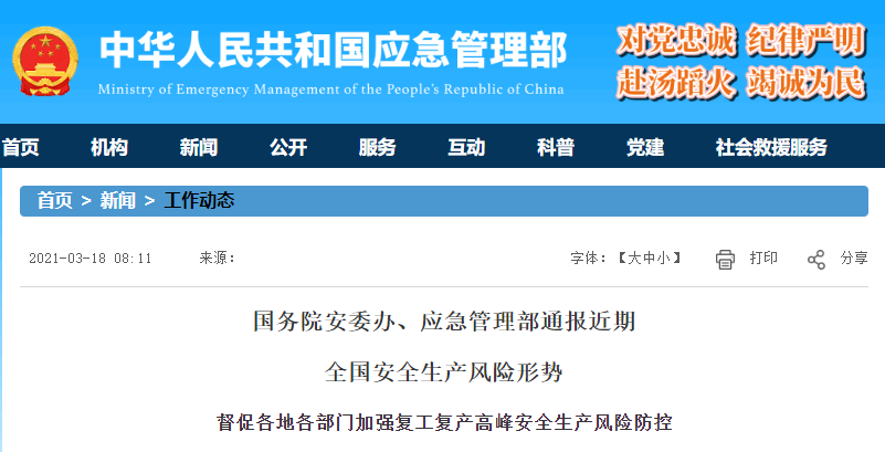 應急管理部官網(wǎng)3月18日消息,近期,各類企業(yè)生產經營活動趨于旺盛,滿負荷、超強度生產情況增多,加之安全生產長期積累的風險在顯露、新的風險在增加,安全形勢嚴峻復雜。為加強各地的復工復產高峰安全生產風險防控,明確重點行業(yè)領域防控重點,根據(jù)近年來春季災害事故特點,國務院安委辦、應急管理部近日通報近期全國安全生產風險形勢,督促各地各部門聚焦重點行業(yè)領域、突出風險防控重點,切實抓好復工復產安全防范工作。