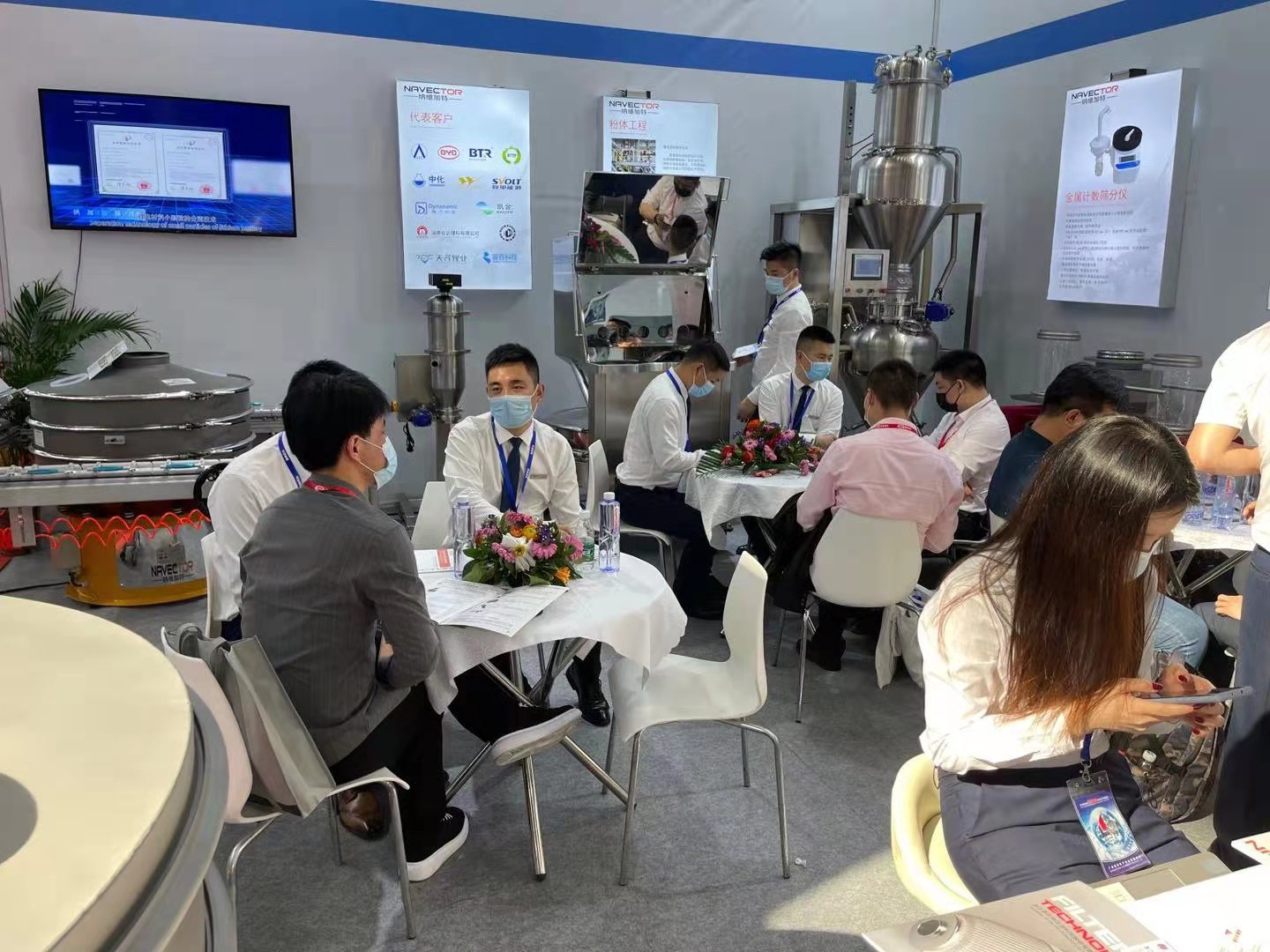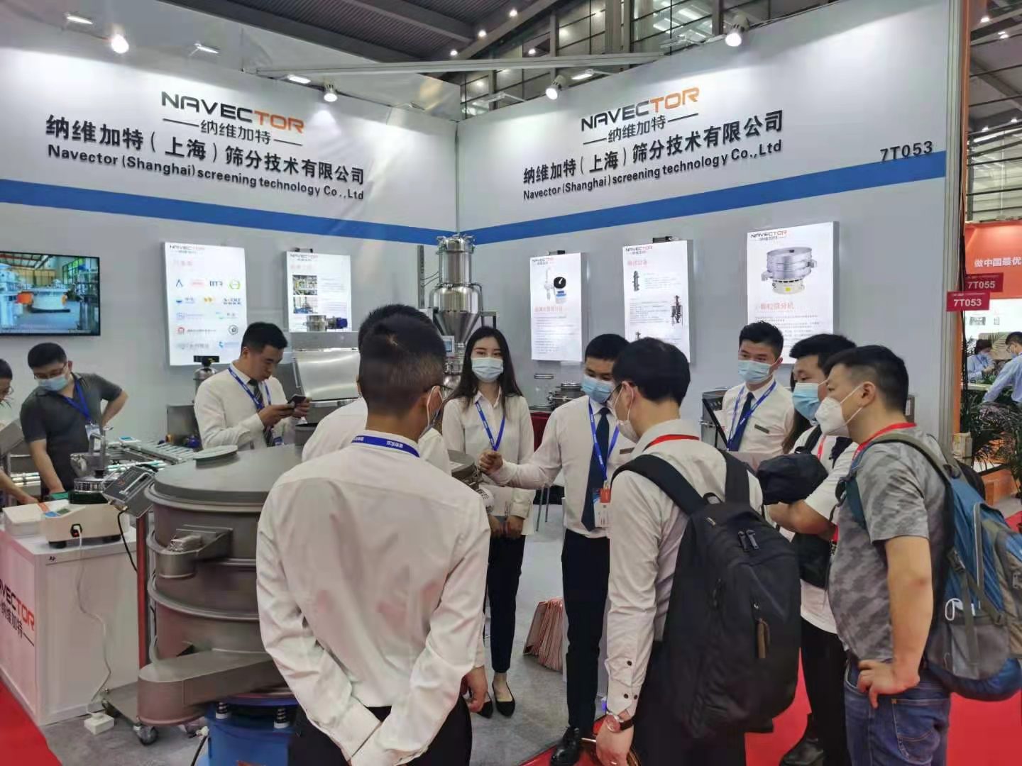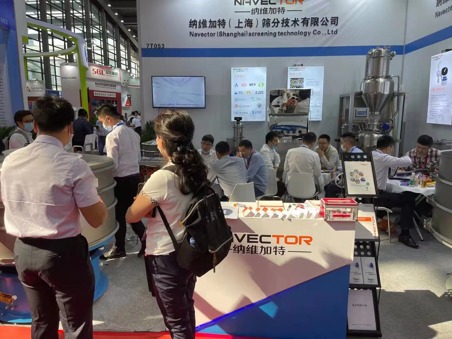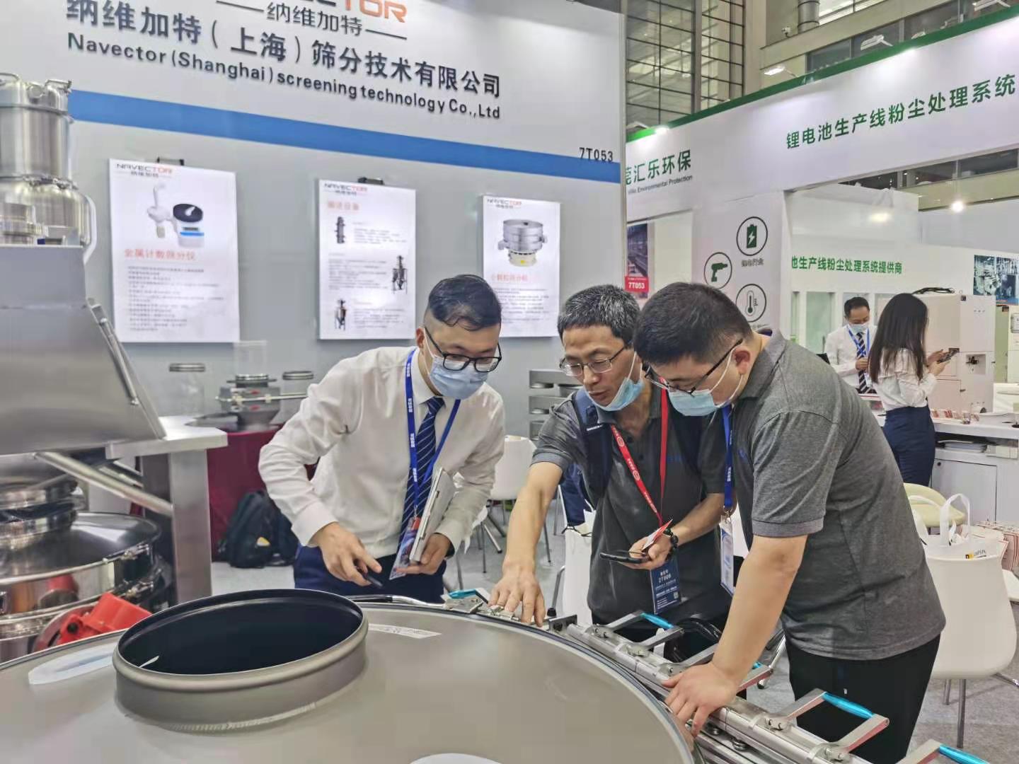 全球化篩分技術與工程方案提供商-納維加特攜小顆粒微米篩、超聲波振動篩、拉網機、無塵投料站、直排篩、正壓輸送設備六大產品隆重亮相,展臺前吸引大批客戶目光前來參觀駐足了解,現場人流絡繹不絕。