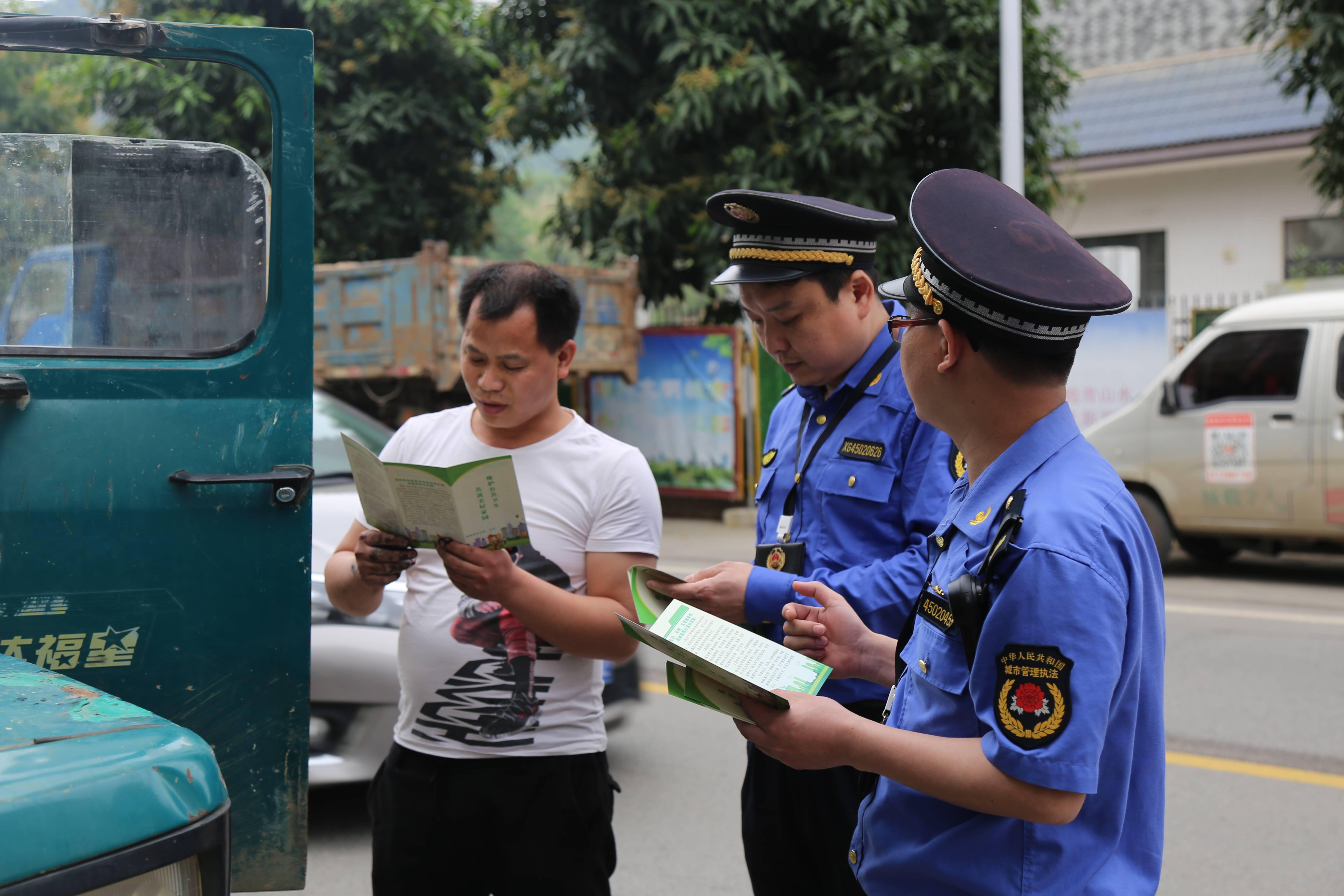 執(zhí)法人員向農(nóng)用車車主宣傳建筑垃圾管理新規(guī)。