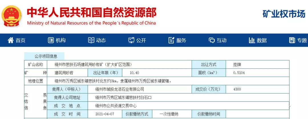 日前,梧州市城投龍浩石業有限公司以4300萬元成功競得梧州市思扶石場建筑用砂巖礦(擴大礦區范圍)采礦權。