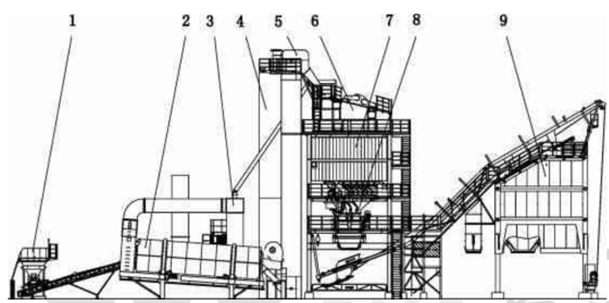 1.冷料系統;2.干燥滾筒;3.除塵系統;4.粉料系統;5.熱骨料提升機;