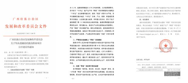 4月初,廣西壯族自治區(qū)發(fā)改委印發(fā)《關(guān)于堅(jiān)決遏制高耗能高排放項(xiàng)目盲目建設(shè)的通知》,指出,根據(jù)國(guó)家有關(guān)會(huì)議通報(bào),廣西“十四五”能耗強(qiáng)度下降目標(biāo)為13.5%,能耗消費(fèi)增量為1170萬(wàn)噸標(biāo)準(zhǔn)煤。從目前掌握的情況,各市擬于“十四五”投產(chǎn)達(dá)產(chǎn)的“兩高”項(xiàng)目新增能耗大幅超出“十四五”全區(qū)新增用能空間,能耗“雙控”形勢(shì)十分嚴(yán)峻。