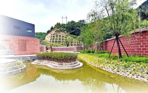沿三環輔道的開口一路向上,就來到這座從益鳳村山谷里“長”出的“綠色小鎮”。步入其中,一個透著綠意的海綿示范區映入眼簾:透水磚、護坡擋墻、工字護坡磚、透水基層等組成了小公園。而這些,都是建筑垃圾資源化利用的產物。