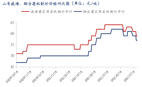 近期北方港口砂石行情穩(wěn)中有跌,港口平倉價格小幅下跌3-5元/噸。北方沿海港砂石常年外銷長三角市場為主,受南方雨水天氣影響,建筑市場整體需求不佳,,因此南下砂石銷量減少,價格偏弱運行。據(jù)統(tǒng)計,截至7月21日,威海、煙臺港機制砂平倉價在61-63元/噸;日照、威海花崗巖10-20mm碎石平倉價格在57-59元/噸;天然河砂中砂平倉價格在75-81元/噸。