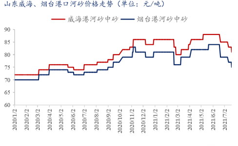 近年來山東沿海地區(qū)煙臺、威海港口一直借助港口優(yōu)勢,將本地優(yōu)質(zhì)高標河砂和水洗機制砂發(fā)往江蘇、浙江、上海、寧波市場,受環(huán)保影響,河道嚴禁開采,天然河砂開采量持續(xù)下降,也受到南方市場需求帶動價格持續(xù)上漲,據(jù)統(tǒng)計,截至7月21日,煙臺港高標河砂平倉75-81元/噸,水洗機制砂含泥量在1%以內(nèi)港口平倉價格在61-63元/噸。7月中旬河砂、機制砂價格均有小幅回落3-5元/噸。本身河砂成本價格不高,由于河砂資源枯竭,加之運輸費用占比較多,隨之河砂到港平倉價格水漲船高。今年海運費也受到煤炭供給及價格上漲影響,3-5月份海運費漲幅高達18-20%。6月中旬市場需求不太樂觀,海運價格開始小幅回落,港口河砂平倉價呈下行趨勢運行。