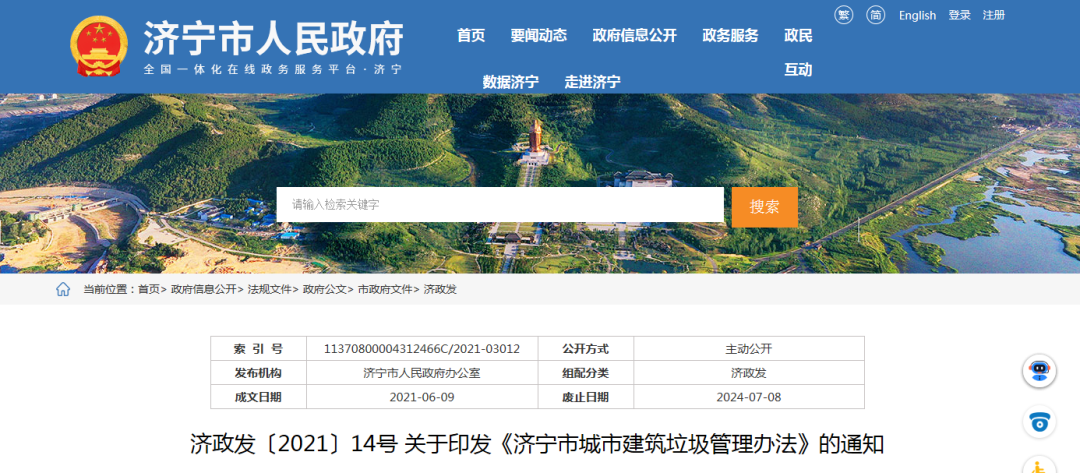 《辦法》適用于濟寧市城市規劃區內建筑垃圾的傾倒、運輸、中轉、回填、消納、利用等處置活動。自2021年7月9日起施行,有效期至2024年7月8日。