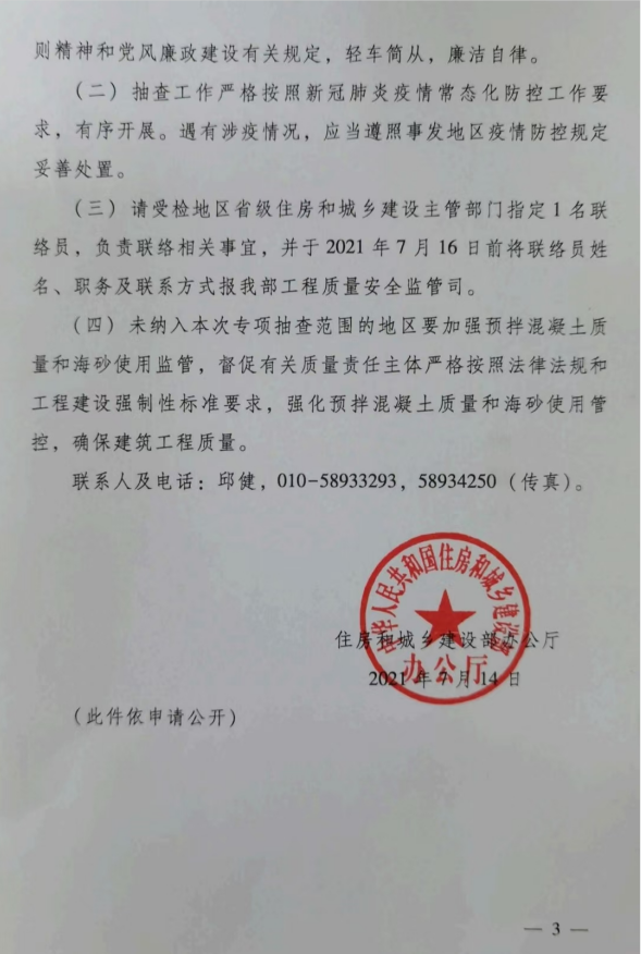 住房和城鄉(xiāng)建設(shè)部辦公廳關(guān)于開展2021年預(yù)拌混凝土質(zhì)量及海砂使用專項(xiàng)抽查的通知