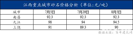 7月份江西地區(qū)砂石市場(chǎng)情緒總體不高,下游需求一般,截止8月5號(hào),南昌地區(qū)砂石價(jià)格穩(wěn)定,暫無(wú)波動(dòng),主要原因是南昌地區(qū)砂石主要供本地市場(chǎng)應(yīng)用,不對(duì)外發(fā)售,砂石價(jià)格波動(dòng)較小。九江地區(qū)砂石均價(jià)94.5元/噸,月環(huán)比下跌3.7%,周環(huán)比上漲0.53%。上饒砂石均價(jià)90元/噸,月環(huán)比下跌1.11%,周環(huán)比上漲0.78%。總體來(lái)看,江西地區(qū)砂石跌勢(shì)收窄,并在月末出現(xiàn)推漲姿態(tài)。
