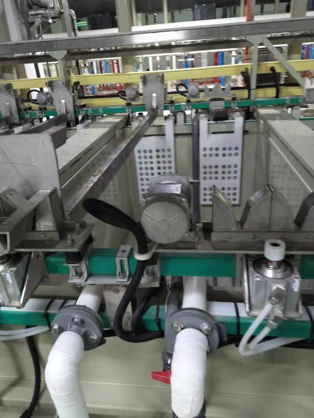 振動電機一般安裝在V座的基座上(如下圖所示),振動電機運轉時,可以將振動最大限度地傳到飛巴上,飛巴隨著移動的天車將固定的PCB板浸泡在不同的化學藥水缸里,可以有效地改善深鍍能力??梢愿鶕婂兇翱诖笮∵x擇單邊安裝或雙邊安裝振動電機,一般飛巴2m以內,選擇單邊安裝即可,飛巴長度超過3m時,需要雙邊安裝才能將震蕩效果傳至整個飛巴。