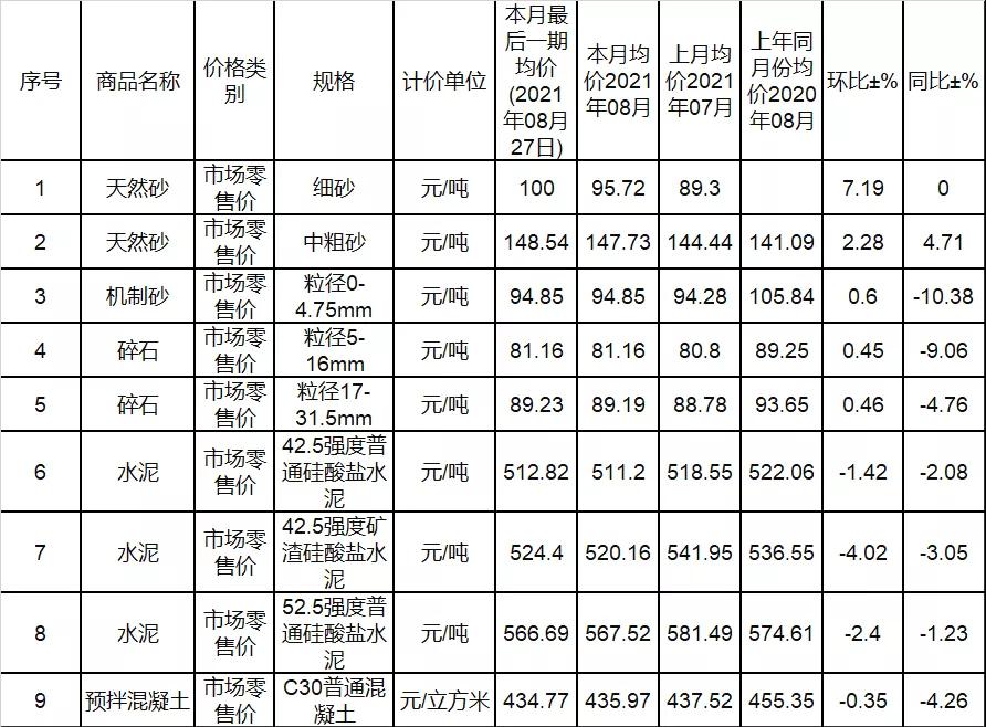 2021年08月全省建筑用砂石水泥混凝土價格同環(huán)比價格監(jiān)測表如下: