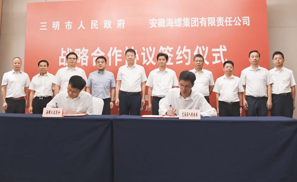 9月8日,尤溪縣人民政府與安徽海螺水泥股份有限公司在廈門正式簽署《海螺(尤溪)綠色建材產業園投資協議》,項目簽約總金額56億元,規劃用地面積約650畝。 市委書記余紅勝,海螺集團黨委書記、董事長王誠,海螺集團黨委委員、副總經理,海螺水泥黨委書記、副董事長王建超,副市長程鵬鷹見證簽約。