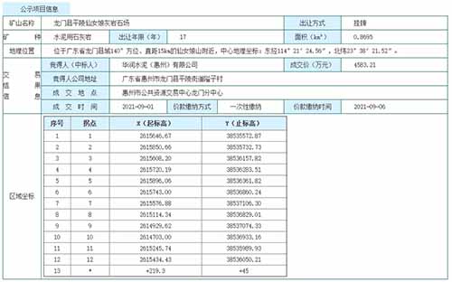近日,自然資源部發布了龍門縣礦業權掛牌出讓結果的公示稱,華潤水泥(惠州)有限公司以4583.21萬元價格競得龍門縣平陵仙女娘灰巖石場水泥用石灰巖礦采礦權。 據了解,該礦區范圍內確定開采資源量水泥用石灰巖3181.57萬噸(含原采礦權人已繳交采礦權價款而未開采的可采儲量)、夾石(含圍巖)1547.55萬噸、第四系殘坡積層325.46萬噸,合計5054.58萬噸。擬出讓年限為17年。 礦山地質環境保護及土地復墾要求:競得人必須按照相關法律法規要求,在申請《采礦許可證》前,編制礦山地質環境保護與土地復墾方案,與出讓人簽訂礦山土地復墾費用監管協議,設立礦山地質環境治理恢復基金,及時預存礦山地質環境治理恢復基金及土地復墾費,履行礦山地質環境保護、土地復墾義務。