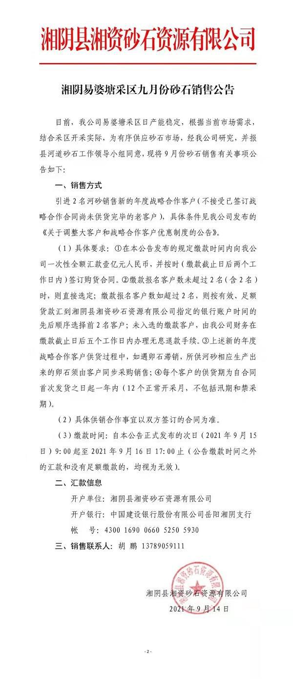 目前,我公司易婆塘采區日產能穩定,根據當前市場需求,結合采區開采實際,為有序供應砂石市場,經我公司研究,并報縣河道砂石工作領導小組同意,現將9月份砂石銷售有關事項公告如下: