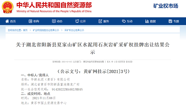 日前,湖北黃石市自然資源和規劃局發布公告,華新水泥(黃石)有限公司以8.2億元的最終價格成功競得湖北省陽新縣夏家山礦區水泥用石灰巖礦采礦權。