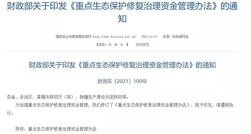 日前,為加強(qiáng)重點(diǎn)生態(tài)保護(hù)修復(fù)治理資金管理,提高資金使用效益,促進(jìn)生態(tài)系統(tǒng)保護(hù)修復(fù),財(cái)政部公開(kāi)印發(fā)了修訂過(guò)后的《重點(diǎn)生態(tài)保護(hù)修復(fù)治理資金管理辦法》,實(shí)施期限至2023年底,要求各地遵照?qǐng)?zhí)行。
