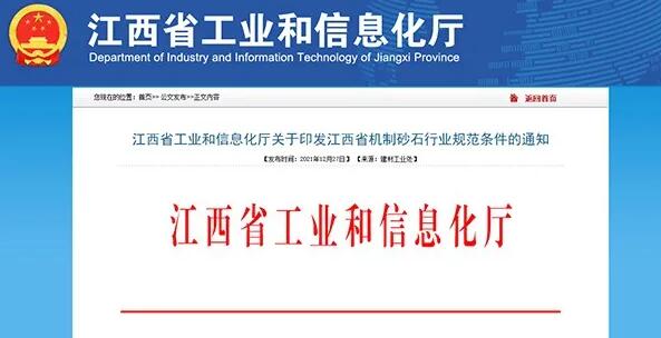 近日,江西省工業和信息化廳印發了《江西省機制砂石行業規范條件》,旨在進一步加強和規范機制砂石行業管理,促進行業規范發展,轉型升級,推動行業高質量發展,適用于江西省范圍內的機制砂石生產企業。