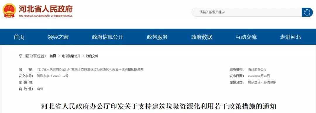 河北省人民政府辦公廳印發了《關于支持建筑垃圾資源化利用的若干政策措施》,文件提出: