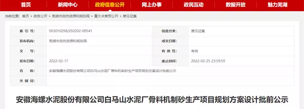 近日,安徽蕪湖市人民政府對安徽海螺水泥股份有限公司白馬山水泥廠骨料機制砂生產項目規劃方案設計進行批前公示。