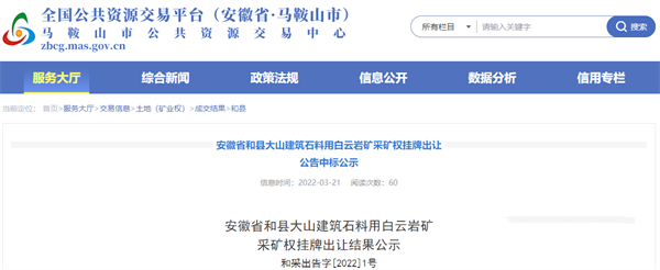 2021年7月9日,和縣公共資源交易中心發布《關于撤銷安徽省和縣大山建筑石料用白云巖礦采礦權項目成交確認書的公告》,稱安徽省和縣大山建筑石料用白云巖礦采礦權掛牌出讓結果公示期間收到異議,經調查核實,存在違規設置前置資格審查條件情形。
