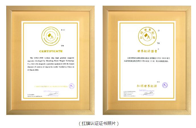 經(jīng)扛旗世界紀(jì)錄機(jī)構(gòu)(CARRYING THE FLAG WORLD RECORDS LIMITED)官方認(rèn)定“山東華特磁電科技股份有限公司自主研制的LHGC-5000型立環(huán)高梯度磁選機(jī)是世界上轉(zhuǎn)環(huán)直徑(5米)最大的磁選設(shè)備”。