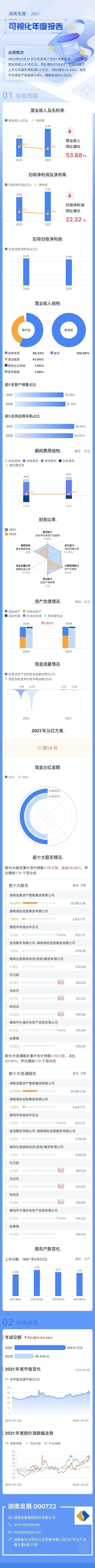 3月30日晚間,湖南發展(000722)披露2021年年度報告。報告期內,公司清潔能源、醫養健康、自然資源三大主業均實現不同程度增長,公司營業收入突破4.78億元,同比大增53.88%;凈利潤1.2億元,同比增長22.32%。