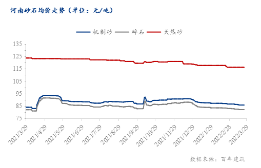 截至3月28日,據(jù)百年建筑網(wǎng)統(tǒng)計(jì),河南砂石均價(jià)為 94.83元/噸,河南機(jī)制砂均價(jià)為85.6元/噸,碎石均價(jià)81.9元/噸,天然砂均價(jià)117元/噸。整體來說,砂石價(jià)格暫穩(wěn)。近期油價(jià)上漲,但河南本地項(xiàng)目需求不高,砂石運(yùn)輸價(jià)格沒有明顯的增加。后期市場(chǎng)需求恢復(fù)的情況下,砂石運(yùn)輸價(jià)格或?qū)⑸蠞q。另一方面,多種運(yùn)輸方式的情況下,砂石運(yùn)輸方式或?qū)⑦M(jìn)一步優(yōu)化。