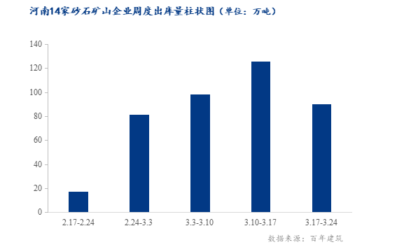 據(jù)百年建筑網(wǎng)調(diào)研河南14家砂石礦山廠出貨量,截至3月24日,14家砂石礦山廠出貨量為90萬噸,環(huán)比下降23.46%。近期受疫情影響,部分砂石企業(yè)沒有正常生產(chǎn),加上項(xiàng)目需求量一般,且運(yùn)輸砂石骨料受到管控,砂石企業(yè)出貨量有所減少。
