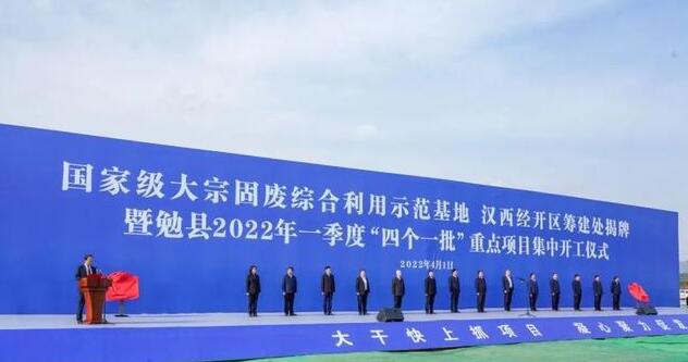 4月1日,國家級大宗固廢綜合利用示范基地漢西經開區籌建處揭牌暨勉縣2022年一季度“四個一批”重點項目開工儀式在勉縣舉行。集中開工國家級大宗固廢綜合利用示范基地建設等項目44個,總投資274.62億元,年度投資48.43億元。