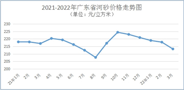 (一)河砂和海砂價格持續(xù)小幅下跌,但海砂價格仍高于去年同期。據(jù)監(jiān)測,3月份全省河砂平均購進(jìn)價為每立方米213元,環(huán)比(與2月份比,下同)下跌2.09%,同比(與2021年3月份比,下同)下降1.68%。其中,中砂(0.35-0.5mm)平均購進(jìn)價為每立方米224元,環(huán)比下跌4.02%,同比下跌1.84%;粗砂(大于0.5mm)平均購進(jìn)價為每立方米203元,環(huán)比微漲0.13%,同比下降1.52%。珠三角地區(qū)海砂(淡化處理)平均購進(jìn)價為每立方米266元,環(huán)比下跌2.29%,同比上漲6.15%。