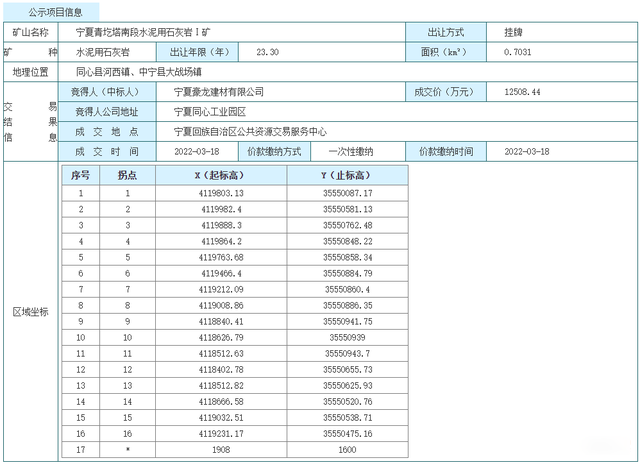 成交價(jià)1.25億元!寧夏豪龍建材競(jìng)得一水泥用石灰?guī)rⅠ礦采礦權(quán)