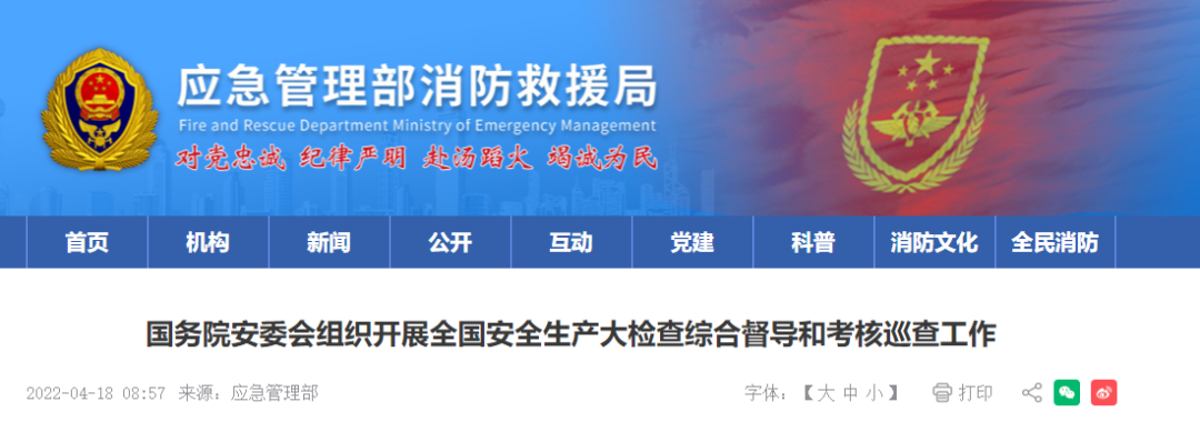 根據(jù)黨中央、國(guó)務(wù)院決策部署和全國(guó)安全生產(chǎn)大檢查工作安排,自4月中旬至6月底,國(guó)務(wù)院安委會(huì)組織16個(gè)綜合檢查組,對(duì)31個(gè)?。ㄗ灾螀^(qū)、直轄市)和新疆生產(chǎn)建設(shè)兵團(tuán)安全生產(chǎn)大檢查情況進(jìn)行綜合督導(dǎo),并同步開展國(guó)務(wù)院2021年度省級(jí)政府安全生產(chǎn)和消防工作考核巡查及國(guó)務(wù)院安委會(huì)成員單位安全生產(chǎn)工作考核。
