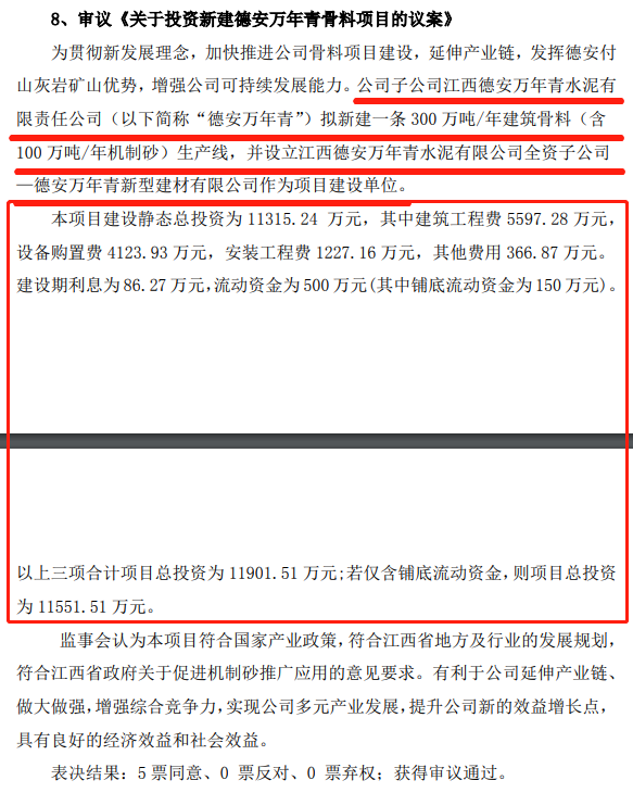 日前,江西萬年青水泥股份有限公司發布《第九屆董事會第二次會議決議公告》審議通過了關于投資新建德安萬年青骨料項目的議案。 公告顯示,江西德安萬年青水泥有限責任公司擬新建一條300萬噸/年建筑骨料(含100萬噸/年機制砂)生產線,并設立江西德安萬年青水泥有限公司全資子公司—德安萬年青新型建材有限公司作為項目建設單位。 本項目建設靜態總投資為11315.24萬元,其中建筑工程費5597.28萬元,設備購置費4123.93萬元,安裝工程費1227.16萬元,其他費用366.87萬元。建設期利息為86.27萬元,流動資金為500萬元(其中鋪底流動資金為150萬元)。以上三項合計項目總投資為11901.51萬元;若僅含鋪底流動資金,則項目總投資為11551.51萬元。具體公告如下: