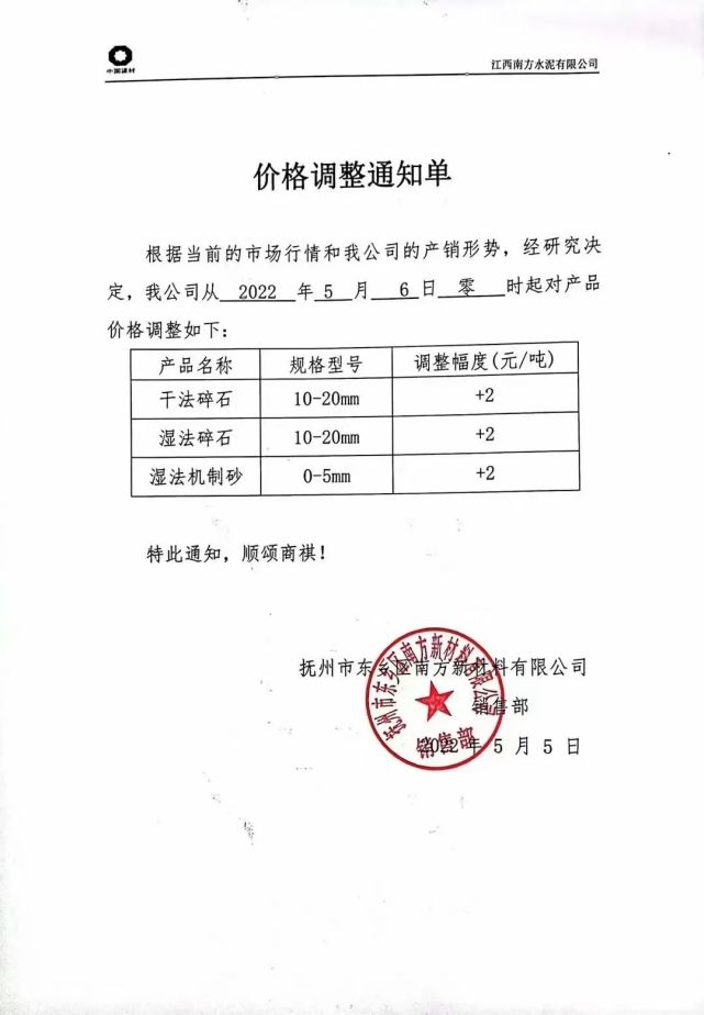 五一節(jié)后,江西撫州(撫州砂石)東鄉(xiāng)區(qū)南方新材料有限公司通知,上調(diào)砂石價格2元/噸,是今年以來的第一輪價格上漲。撫州東鄉(xiāng)區(qū)南方新材料公司為江西南方水泥集團子公司,在撫州以及南昌等地頗具代表性。