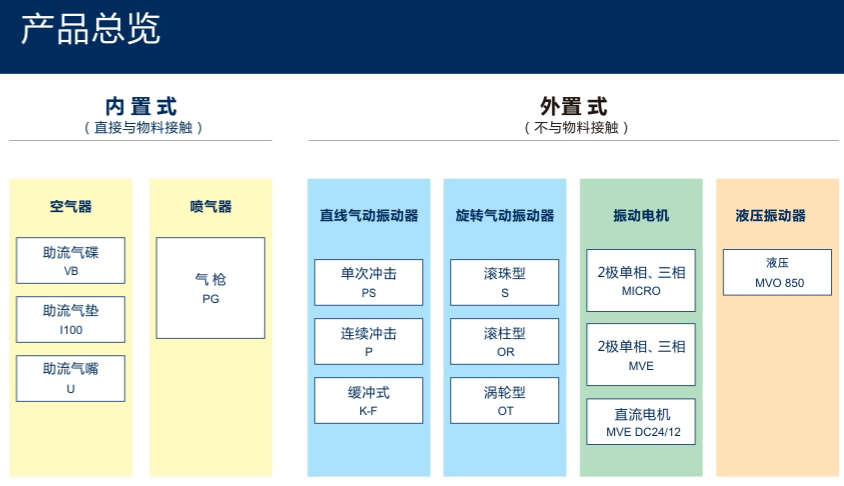 氣碟、氣嘴、氣墊、氣錘、組合氣錘、直線氣動振動器和旋轉氣動振動器等。