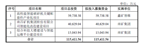 根據(jù)預(yù)披露的招股書(shū),南昌礦機(jī)擬募集資金投入后市場(chǎng)等相關(guān)項(xiàng)目的建設(shè)。其中,高性能智能破碎機(jī)關(guān)鍵配套件產(chǎn)業(yè)化項(xiàng)目,總投資59738.58 萬(wàn)元;南昌礦機(jī)集團(tuán)股份有限公司智能化改造建設(shè)項(xiàng)目,總投資40629.04 萬(wàn)元;綜合科技大樓建設(shè)與智能運(yùn)維平臺(tái)建設(shè)項(xiàng)目,總投資15043.94萬(wàn)元,合計(jì)總投資約11.54億元。